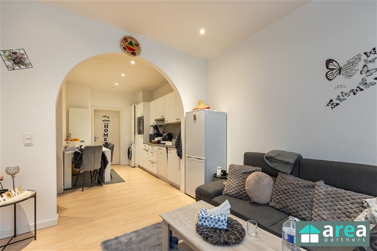 Lichte living (12 m²) met aanpalend een kleinere slaapkamer (7 m²). Aansluitend aan de leefruimte bevindt zich de volledig geïnstalleerde keuken (9 m²). Achter de keuken ligt de tweede, ruime slaapkamer (12 m²) met aansluitend de badkamer (3 m²), uitgerust met een douche. Vanuit de inkomhal is er bovendien toegang tot een apart toilet.